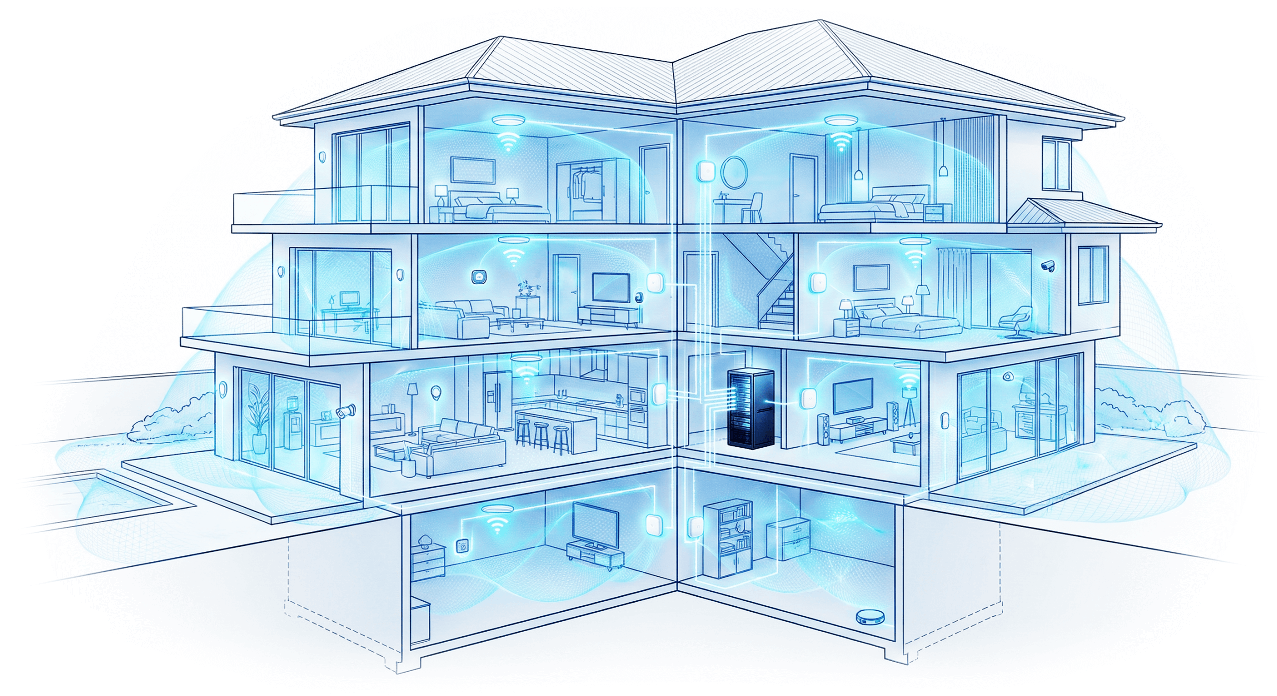 作为智能家居的基石,我们打造企业级的 WiFi 6/7 覆盖方案。确保在多设备接入的情况下,依然拥有极低的延迟与无缝的漫游体验,为全屋智能设备提供坚不可摧的连接保障。